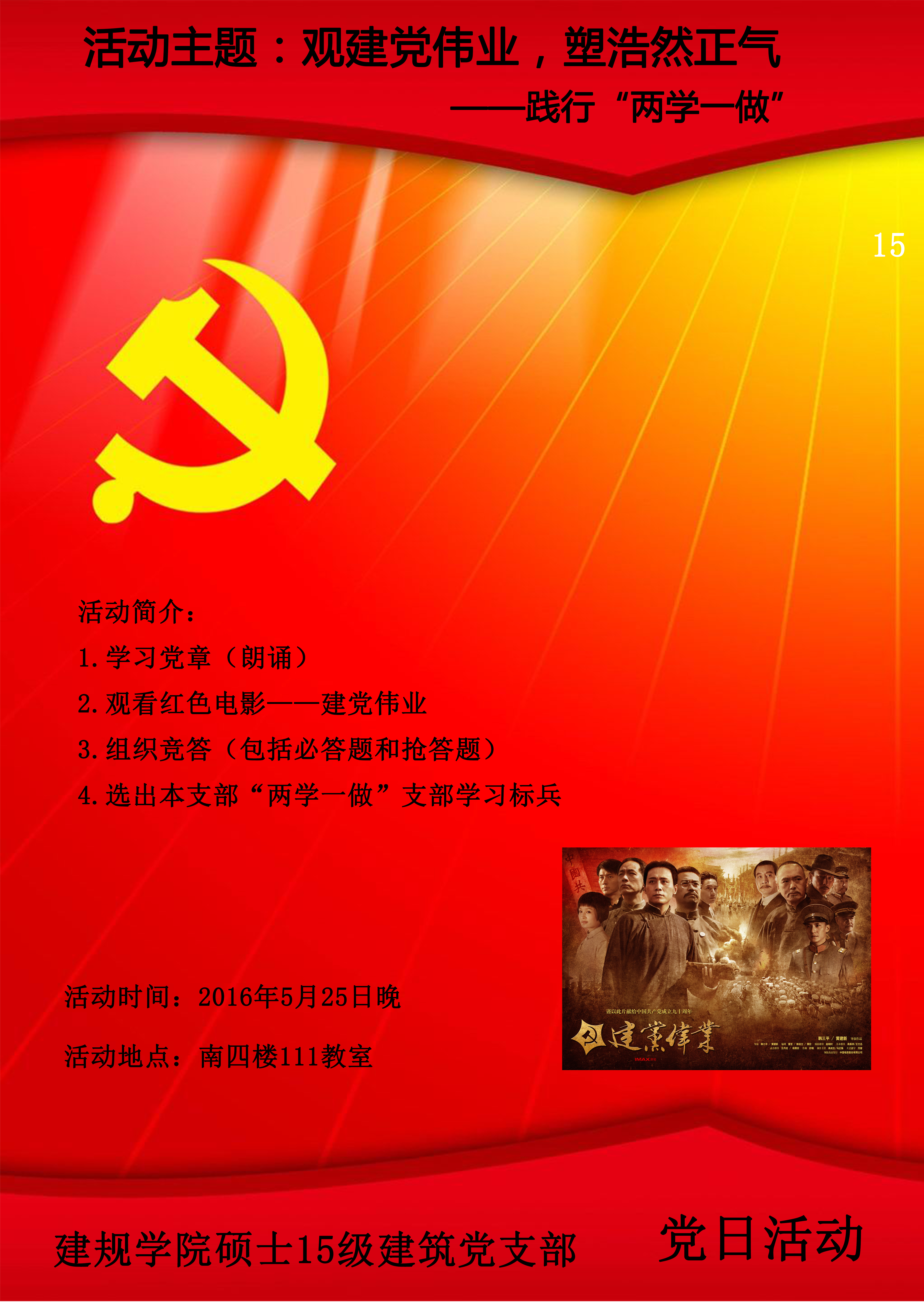 本次活动共有三个部分。第一部分是朗读党章,每位党员都选取自己感触最深的一部分现场朗读。重温党章,可以深入地了解马克思主义建党学说的发展,更好地总结党的建设的经验教训,加强党的建设,推动革命、建设和改革事业不断向前发展。第二部分是观看电影建党伟业,剧情时而澎湃,时而唏嘘。观影过程中大家都很投入,在将近两个小时中回顾了从1911年辛亥革命爆发开始至1921年中国共产党第一次全国代表大会召开为止共10年间中国所发生的一系列重大历史事件。第三部分是竞答活动。根据党章和电影的学习内容,我支部组织学习成果竞答,并最终选出本支部“两学一做”支部学习标兵,给学习出色的党员颁发奖品。