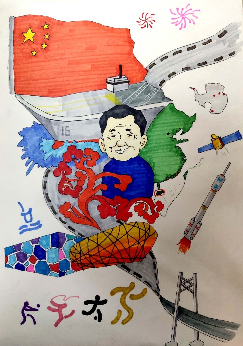 创作解读:从1949年到2019年,70年间的风风雨雨,中国成为了一个强大的国家,一件件大事的发生见证着新中国的风雨路程,见证着祖国的发展。经济特区,南极科考站的建立、神舟载人航天的发射、辽宁号及国产航母的诞生、奥运会的举办、港珠澳大桥的建成通车等等,从国防、科技、文化等方面展现了新中国成立以来的伟大成就,使中国屹立于世界民族之林。画作选取了祖国70周年以来的一些大事件,以此唤起人们的国家记忆,砥砺前行,表达对祖国的热爱,为中华民族的伟大复兴而奋斗。