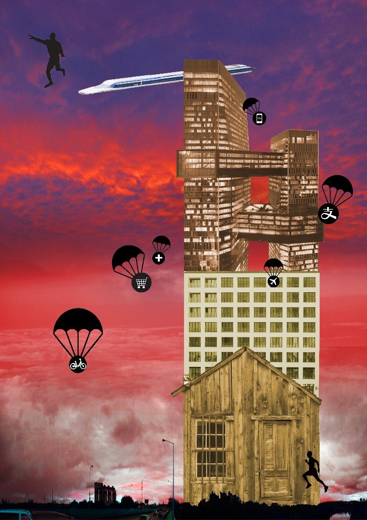 创作解读:今年是新中国成立70周年。就在快速腾飞几十年中,科技成为中国发展的主要社会引擎,中国的“旧四大发明”也向“新四大发明”迈进(高铁、共享单车、网购、网络支付)。“新四大发明”有的缩短了时空的距离,有的引领了绿色的出行交通模式,有的改变了延续几百年的货币流通方式,它们都是中国“智慧城市”的标志性发明。科技革命还将继续,在这场超越工业革命的改革中,我们希冀着未来的中国将会依托先进的科技完成发展中国家到发达国家的跨越式转型。