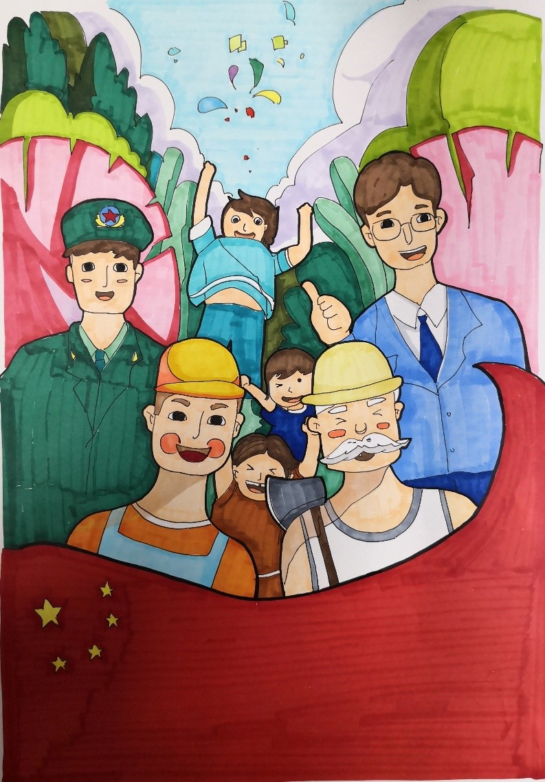 创作解读:《歌颂祖国》描绘了军人、商人、职员、农民工和小孩子庆祝国庆的场景。这几个具有代表性的不同职业、不同背景的普通人,他们在生活中兢兢业业、奋发向上;正是由无数个小我,才组成了祖国这个“大我”。今年是建国70周年,不同的人坚守在自己的职位上,都在为了建设更好的中国而奋斗。我们这一代年轻人应坚定信念,提升能力本领,担当现在,勇敢创造未来。