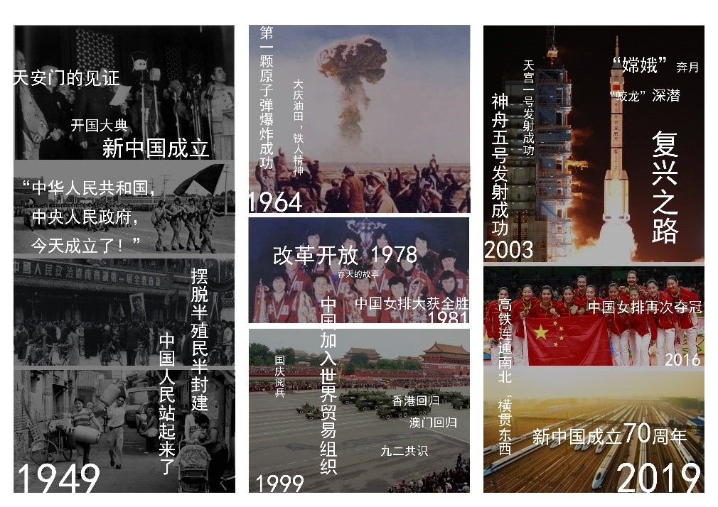 创作解读:过去的70年是令每一个中国人倍感自豪的70年,在这期间,中华民族的伟大复兴徐徐拉开序幕。在中国共产党的带领下,中国完成了一项又一项震撼人心的壮举。因此,我们本次选取各期间的重要事件作为创作主题,从1949年开国大典,到1964年第一颗原子弹爆炸成功,再到1978年改革开放,以及1999年加入世贸组织、2003年神舟五号发射成功等等,这些事件不仅是中国辉煌历史的写照,更是每一个中国人努力的成果,我们希望以此作为契机,激励中国青年继续向前奋斗,实现中华民族伟大的复兴梦。