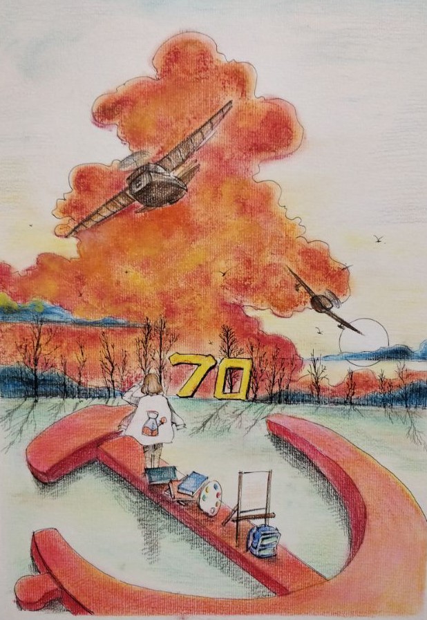 创作解读:整幅作品以天际线为轴分为上下两部分。下方是一个党徽的形状,做成立体感,在竖轴上站立了一位仰望天空的身着化学烧瓶符号披风的少女,身后放置了一些学习用品,少女的形象正代表着广大的员工青年人;上方是有浓厚云彩的大片天空,伴有两架飞机在空中,浓厚的云彩表现出了一种磅礴的气势,飞机代表我国冉冉发展的实力;正中心是一个大大的70,点明70周年的主题。建国70年,中国以惊人的发展速度奋起直追,至今跻身世界大国,离不开的是广大青年人的有所作为,广大劳动人民的辛勤劳动。在70周年的今天,作为一名老员工,只有怀揣着对祖国的一片热忱和满腹的才学,为祖国的明天贡献出自己微薄的力量。