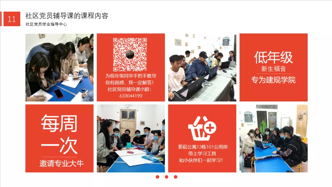 别着急,部门建立了社区党员学业指导中心QQ群,长期开放学业学术交流平台,宣传每周的课程情况,也会在群内会不定期提供书籍软件安装资源等。我们欢迎大家在群里分享自己的困惑,也很乐意为大家答疑解惑,更期待大家能加入党务中心这一大家庭!