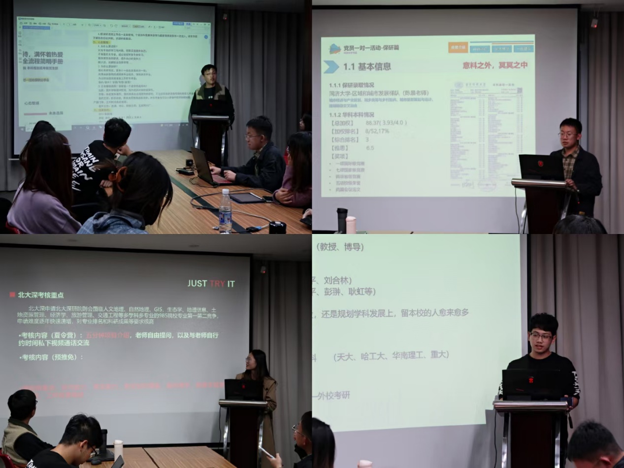 在保研分享会上,崔澳、李湘铖、赵瑜琳、刘思杰四位分别保研至东南、同济、南大、华科的支部党员向大家详细分享了规划专业保研赛道的最新情况,展示了保研全流程中专业方向选择、导师选择、保研材料准备、夏令营参营、学硕专硕选择、正式推免系统填报等主要步骤,获得了在场结对团员的一致好评。