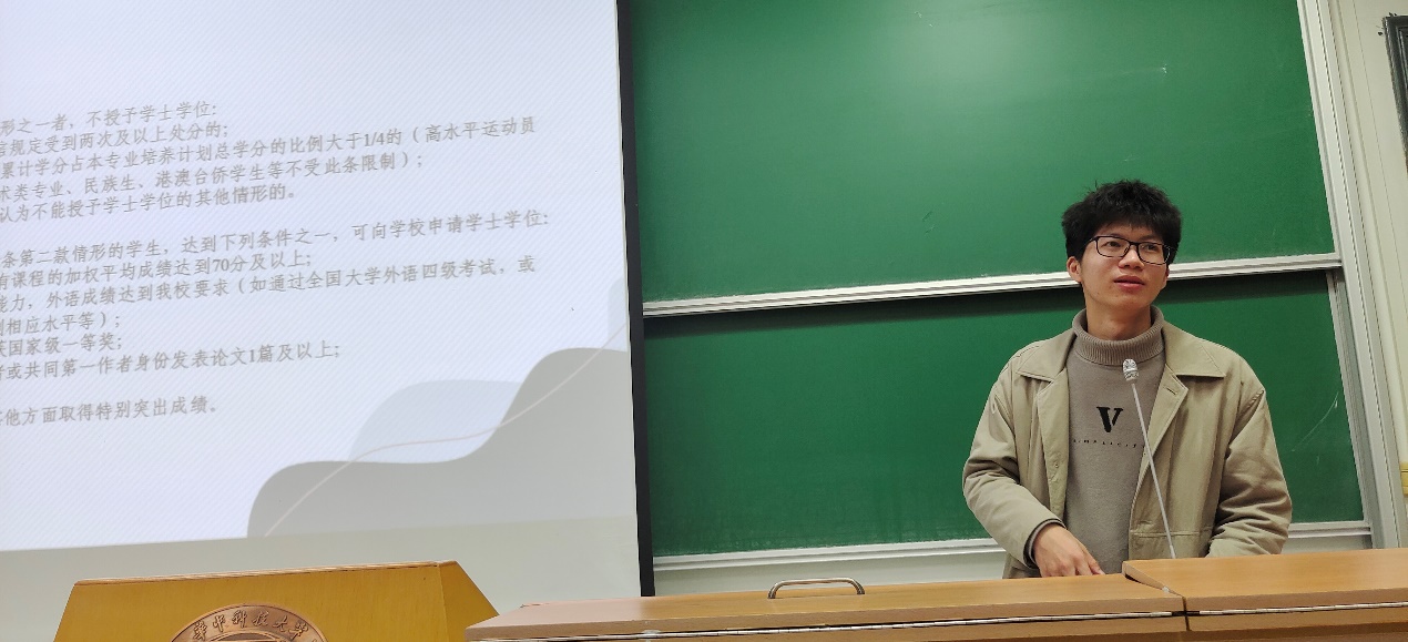 接下来,叶少华老师对21级的培养计划和学籍管理制度进行了简单的解读,针对公共选修课、专业选修课、课外学分、四六级的相关要求进行了介绍,提醒各位同学按照要求对课程进行修习。且强调了学分清理,告诫同学们一定认真学习,不旷课、不挂科,顺利毕业。