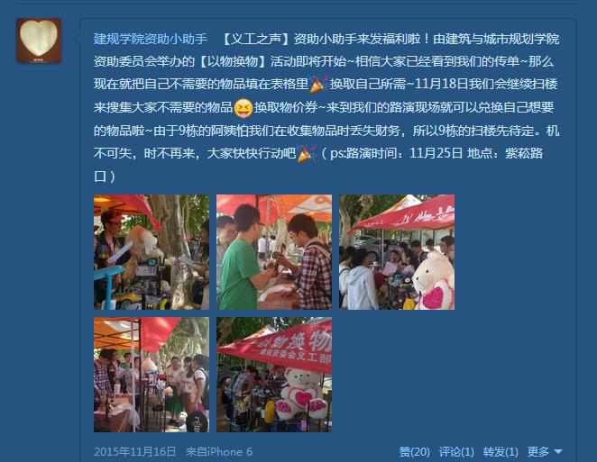 平日里的爱心宿舍会收集旧瓶子,将其转换为捐助基金后汇总到校资助中心,统一对捐赠对象进行捐赠。而在特定的活动里,各院系资委会阳光俱乐部会联合起来,通过更广泛与效率的形式,来进行爱心宿舍活动。