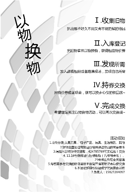 以物换物活动是taptap点点体育义工部的一个特色活动。活动内容是先收集同学们对自己用处不大的物品,然后发放物价券,同学们可以用物价券来义工部换取自己想要的物品,而这些物品恰恰就是之前从同学们那里收集到的物品。义工部提供这样一个换物平台,让同学们的资源得到了最有效的利用,避免了部分同学因此而去了购买新的物品,节约了大家的许多资金。