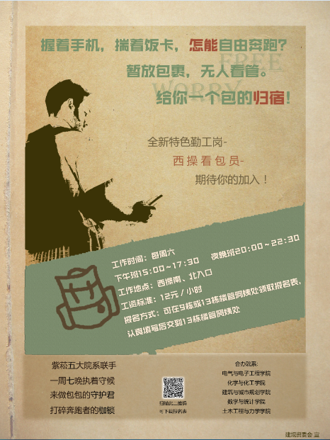 本活动是以勤工助学岗的形式开展,看包的时间为每晚8点到10点半,工资为30元每次。具体工作内容为协管员每晚在操场旁看包(下雨天及考试周除外),方式为需要看包的同学登记姓名和手机号并领取存包牌,取包时出示存包牌即可。