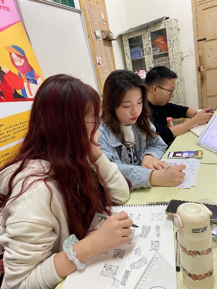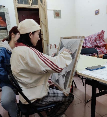 讲完基础知识后,同学们马上将理论运用到实践中。罗雅倩同学针对各个同学的不同情况,进行了一对一的个人辅导,分别指出同学们作品中存在的问题并给出建议,帮助同学们更好地修改完善自己的画作。