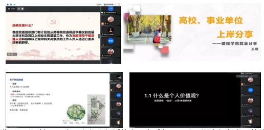 每一位分享嘉宾结合自己的求职经验和心得体会毫无保留的真诚分享,以便公司研究生们能找准未来发展方向。李彦群和辅导员王玥给大家详细介绍了选调生备考经验,包括“选调生是什么”,“公务员体系与事业单位的区别”,“各省市的选调条件”,“选调生备考经验”等,同时还推荐了众多资讯信息网站、公众号和备考资料。