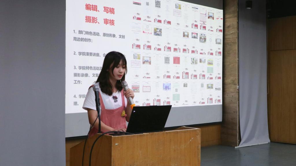 并由党务部、新闻部、实践部、文体部、学术部、办公室负责人分别进行部门职能、日常工作、部门风采的介绍。其中伍岳同学用一段rap进行部门的介绍,引得在场同学们的掌声连连。