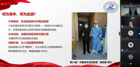 卢诗霞同志以演讲视频《后浪》为楔子,向大家阐述了她心中的后浪。后浪是坚守防控第一线的医务人员,例如第24届“中国青年五四奖章”获得者——taptap点点体育同济医公司的周宁医师。他不辱使命,在危重症救治中蹚出新路;分享经验,向国际防疫贡献中国方案;创新科普,为人民健康默默奉献。