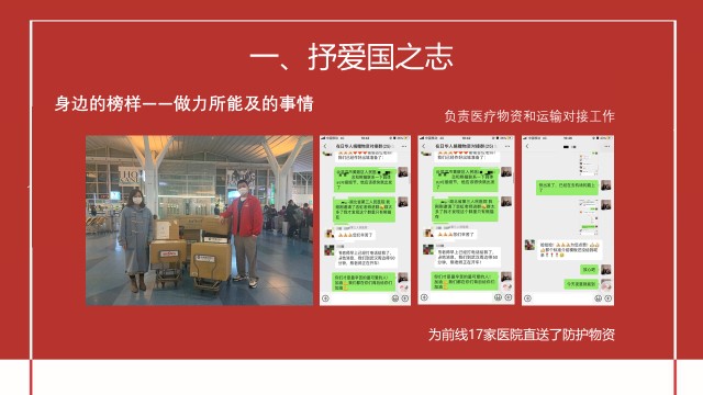 马含琴同学通过分享自己在家做的员工工作,例如举办博士生沙龙,开展就业指导活动,包括公众号发布一些求职小贴士等,以及员工专访系列活动,将请来四位优秀的已毕业员工前辈为大家答疑解惑,解答大家的和求职和就业相关的问题,帮助公司即将毕业找工作的学长学姐明确职业方向,教给大家一些求职技能,缓解大家的就业压力,来诠释“怎么爱国”这个问题,事情虽小,但一点一滴汇聚,终能凝聚力量。