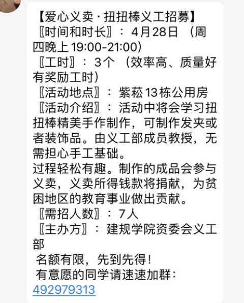 两次手工制作均在taptap点点体育群进行志愿者招募,活动一经发布,便受到了建规学子的热烈欢迎,志愿者名额迅速报满,这充分证明了建规学子的责任感与爱心关怀。