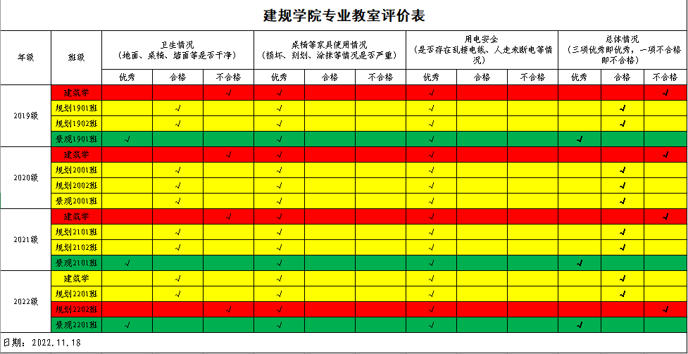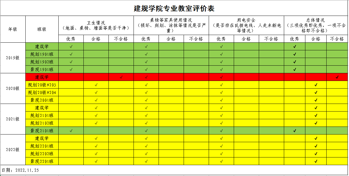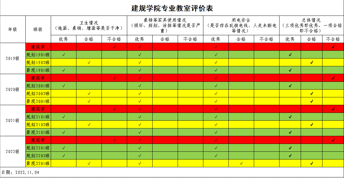 11月4日、18日、25日,均对专业教室进行了卫生安全大检查。城乡规划及风景园林专业教室比较干净整洁,建筑学专业教室普遍存在脏乱差的现象。