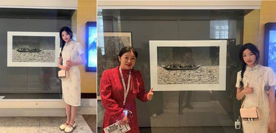 正当我参观得入迷时,忽然间,墙上的一幅现代画引起了我的注意。画风的熟悉感涌上心头,“总觉得这这幅画在哪见过,似乎是在大一的美术课里… ”我低头寻找作品信息栏,竟然看到了我大学老师的名字!我四处寻找母亲。而当我告诉她看见了我老师的画时,她也同我一样激动,我们接连与画作合影。我当时便联系了我的老师,他也对员工碰巧看到自己的画作感到震惊又高兴,毕竟这个概率会有多小呢。