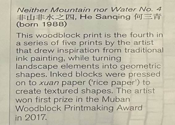 (译文:这幅木版版画是艺术家从传统水墨画中汲取灵感而创作,五幅版画中的第四幅,同时将风景元素转化为几何形状。墨块被压在宣纸(宣纸)上,形成有质感的形状。2017年获木版版画一等奖。)