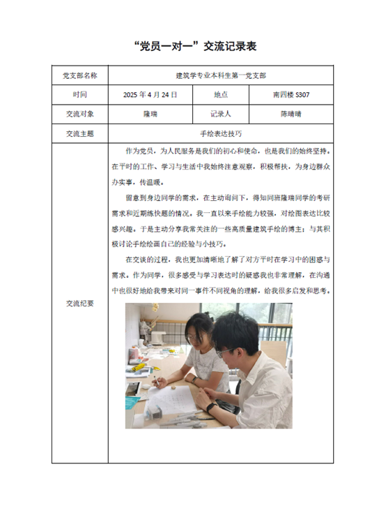 建筑学专业本科生第一党支部陈晴晴与隆瑞就手绘表达技巧进行讨论。