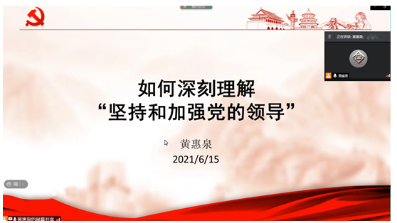 本次党课学习内容由党支书黄惠泉主讲,演讲主题为“如何深刻理解坚持和加强党的领导”。