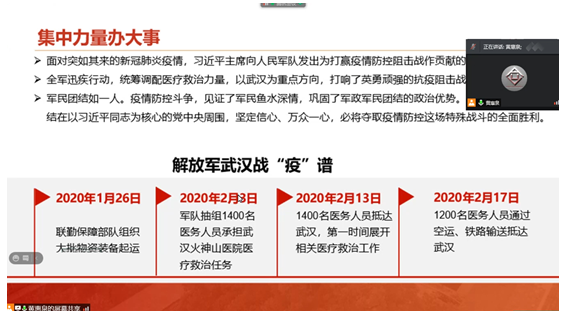 当介绍到坚持和加强党的领导的优越性时,黄惠泉从中国战“疫”时期的具体案例展开,介绍了在2020年新冠疫情时期,全国人民在党的统一领导、统一指挥下,军民团结如一人,紧密团结在以习近平通知为核心的党中央周围,一步步夺取疫情防控的胜利的过程。成员们感触颇深,体会到了在党的领导下,全国人民可以集中力量办大事,以应对国内外面临的种种挑战的好处;可以“一张蓝图绘到底”,在共产党长远治理国家的手段和思路中,不断取得巨大成就,一步步实现中华民族的伟大复兴的好处。