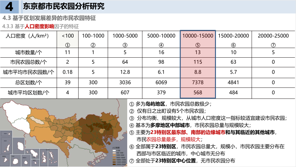 基于中心城市区划发展差异视角,苏老师对东京都市民农园空间格局特征进行量化,从其现状、分布特征、数量规模进行分析,并总结出其与城市人口密度与耕地面积的关系:
