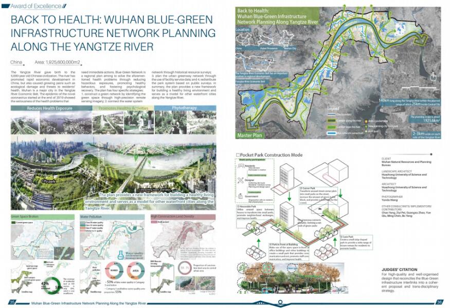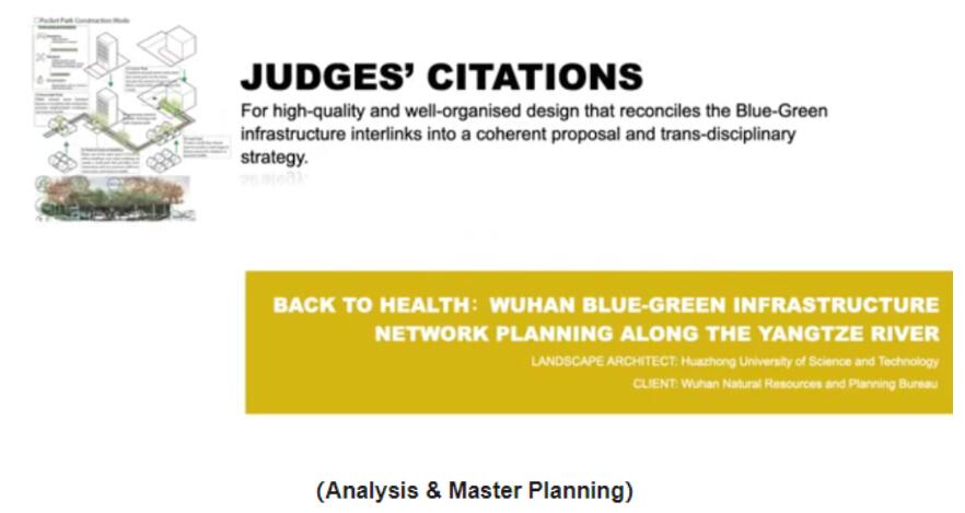 疫情期间,公司景观学系戴菲教授率领工作室硕博研究生团队,通过线上办公交流,组织参与了今年IFLA APR的项目报奖,并提交了一个作品“Back to health: Wuhan blue-green infrastructure network planning along the Yangtze River(重返健康:武汉市沿江蓝绿基础设施网络规划)”。近日IFLA主办方公布了获奖作品,该作品荣获分析与总体规划类的优秀奖,本次获奖是继去年获得荣誉奖基础上的再次突破。