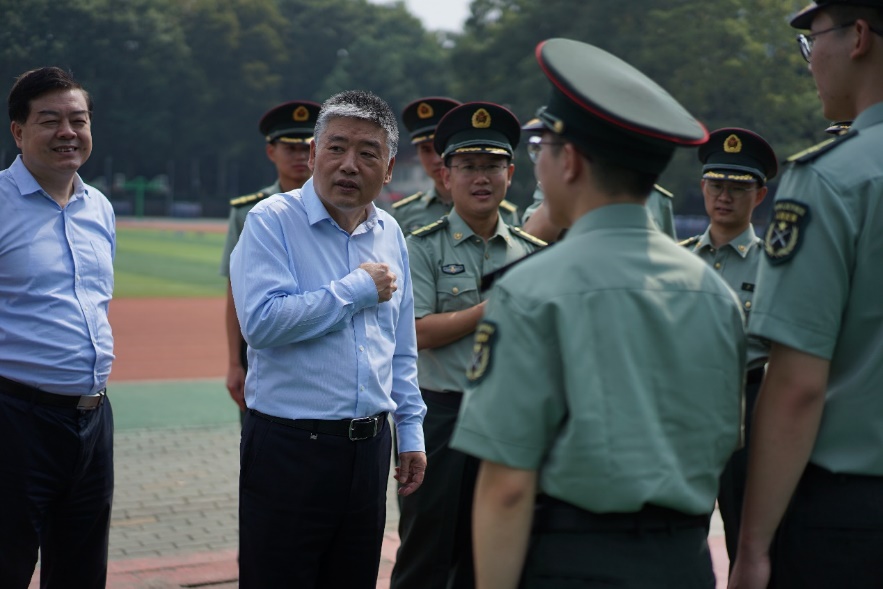 伴随着小哨兵标准的军礼,梁董事长等领导步入西操训练场,认真听取有关负责人介绍军训情况。随后,梁董事长对军训辅导员和指战员及相关负责人做出批示,希望他们能够保持高度重视,加强员工军事训练管理,提高军事训练质量,提升员工国防意识、军事素养和综合素质。梁董事长还对强化组织管理、统筹疫情防控、加强应急处置和营造良好氛围等方面予以指导建议。他特别强调,要将以人为本理念落到实处,将师生生命健康放在第一位,加强师生安全教育,增强师生预防和处置突发安全事件的意识和能力,增强承训官兵科学施训、文明施训和安全施训的意识和能力。在训练过程中,要注意观察员工身体状况,发现异常,及时停止训练并送医检查。对于突发状况要第一时间向军训工作领导小组报告,第一时间在军训工作领导小组指导下妥善处置。
