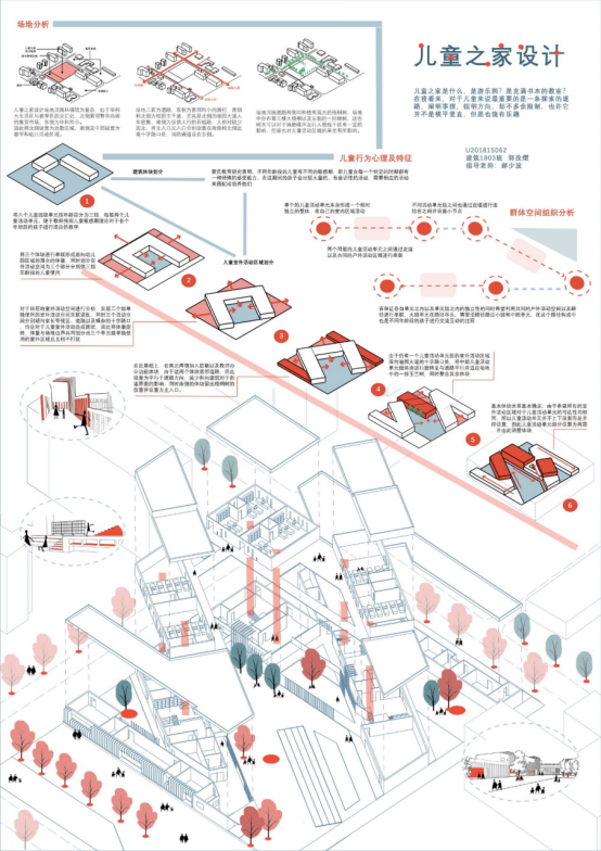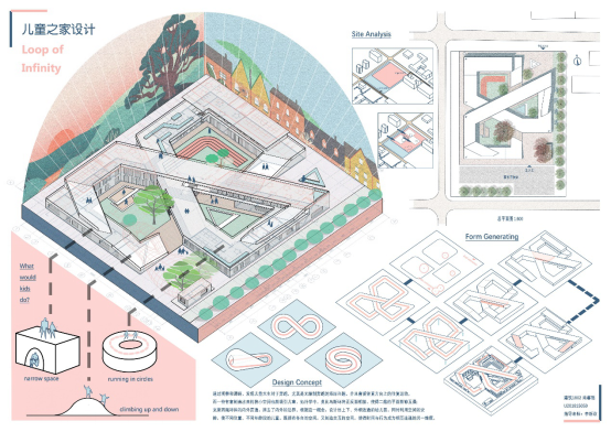 设计感想:对于儿童之家的设计我本是没有底气的,因为对于儿童的接触并不是很多,疫情期间不能实地考察,便看了很多的视频。通过这些视频,我发现了儿童行为的几个特点,将他们与一些拓扑学中的概念结合之后,得到了不错的概念。之后将概念落实到实体经历了很多推敲,最终得到的成果还是可以很好的体现出我的初心,就是一个将上下、内外、时间这些维度连通的儿童之家。