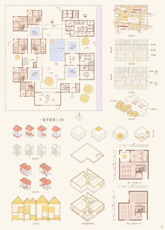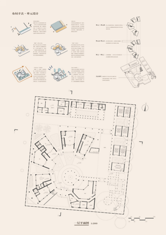 设计感想:本次设计过程中,前期概念发展和理论研究都较为顺利,但中期方案拘泥于局部的形式和关系,忽略了整体关系的自由性。尽管在后期做了调整,但最终剖面关系简单,单元形式单调,对于核心概念的发展有很多遗憾。设计中关于群体空间组织和针对特定群体的空间设计学到了很多。