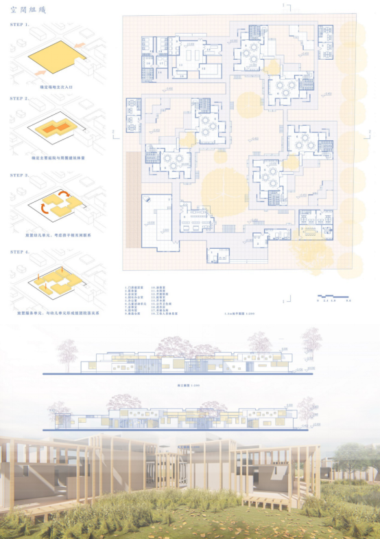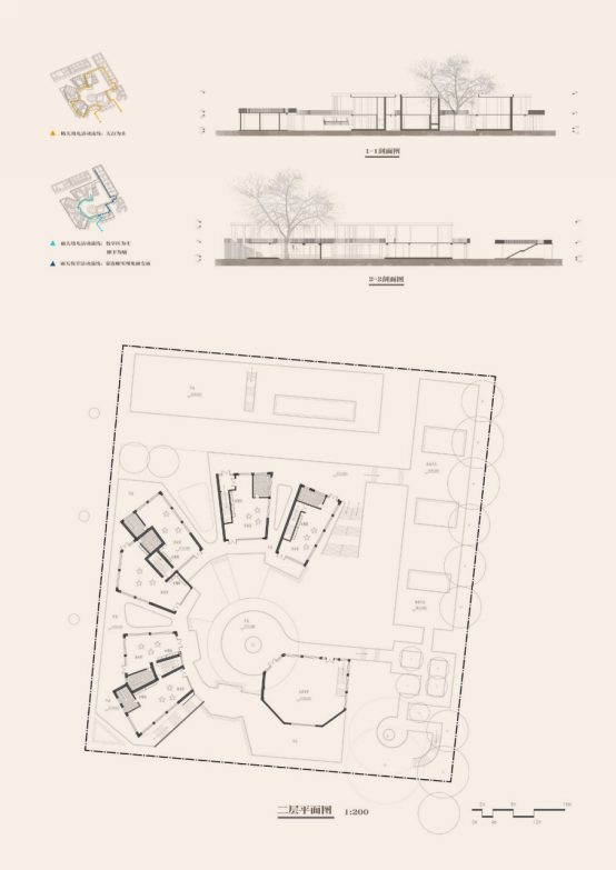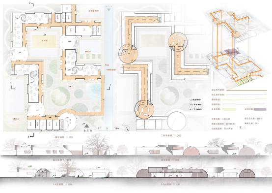 设计说明:在蒙台梭利的教育理念中有这样一句话:孩子被放到自然环境中,他会显示出自己的能力。孩子们天性好问,对事物特别是对自然总抱着探索心态,也特别热爱到户外活动,同时在成长的过程中,他们开始学会分享、团队协作。基于幼儿的这些行为,开始进行我的儿童之家设计,建筑本身对室外场地进行了划分,并设置了不同的主题,草地、沙地、橡胶铺地,通过延伸二层平面围绕着树木,拉近了孩子们与树木的距离,同时设置了二层廊道让孩子们游玩在不同场地之中,穿梭于树木之间,拉近与自然的距离,发挥出孩子们的天性。