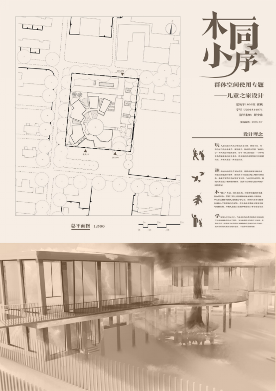 设计感想:因为儿童之家的设计比较综合,在整个设计过程中经常会出现理不清头绪的情况,如何将前期的天马行空的设想融入设计,如何做好单元与整体之间的协调等等问题真的令人迷惑,但在纠结地探索过程中也逐渐明确了自己的理想中儿童之家的样子,在暗含秩序的“无序”变化中提供释放天性的可能,希望每个孩子都能拥有一个快乐童年~