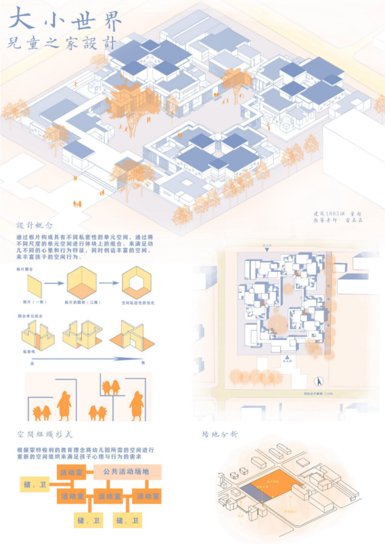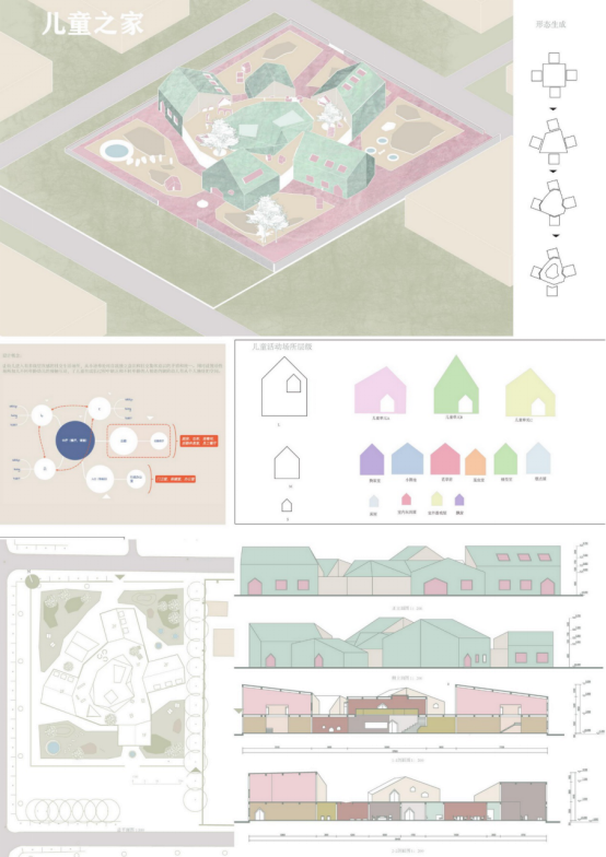 设计感想:儿童之家是一个非常具有挑战性的课题,它的侧重点不再是单一建筑空间及单一行为人的活动研究,而是需要综合考虑地形地貌、区位环境、人群构成、交通组织等多种要素。难点于此,而突破点也恰恰就在这里,能够适应性地结合人群活动和社会环境作出布局的解答,是该设计中令我最满意的所在。