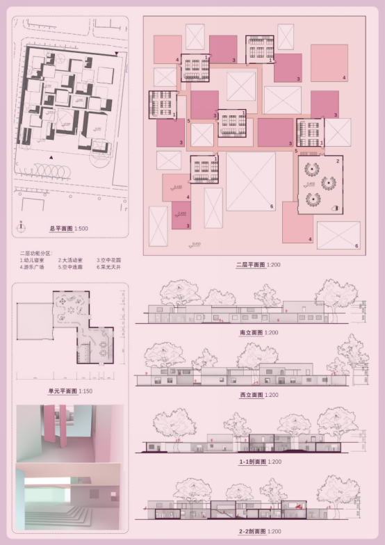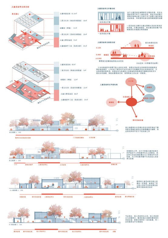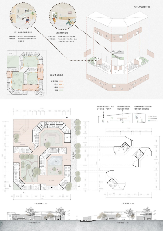 1、群体空间与使用:以儿童为主角,组织多种人群互动与共享建筑空间使用;
