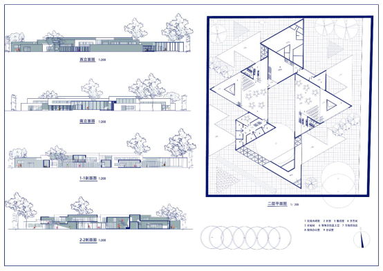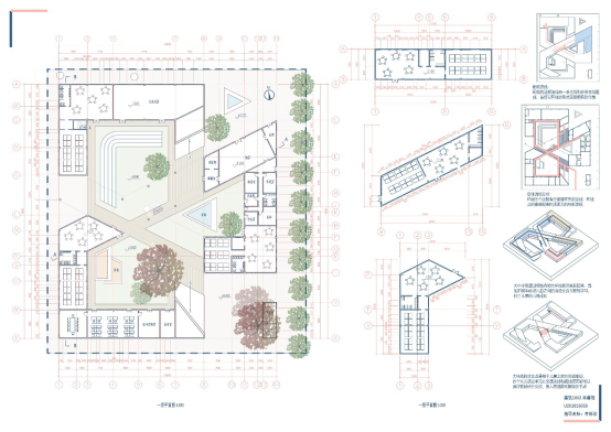 设计说明:本方案希望通过不一样的方式组织群体活动,并使建筑中活动的各个群体在满足自己的活动需求的同时互相产生有机的联系。希望儿童之家中本班儿童之间、同年龄段的儿童之间、儿童与教师之间、儿童之家内部与街道之间都产生交互,并由此出发点生成“Z”字基本形式,该形式可以使得一段直线内布置相同的功能区域,相对不受打扰,而不同的直线之间可以围合成朝向场地外部的三角形室外区域,儿童可以在三角形区域内活动,并可以与街道以及其他人交流。希望通过这样的设计将儿童之家“打开”,同时也构建清晰的内部系统。