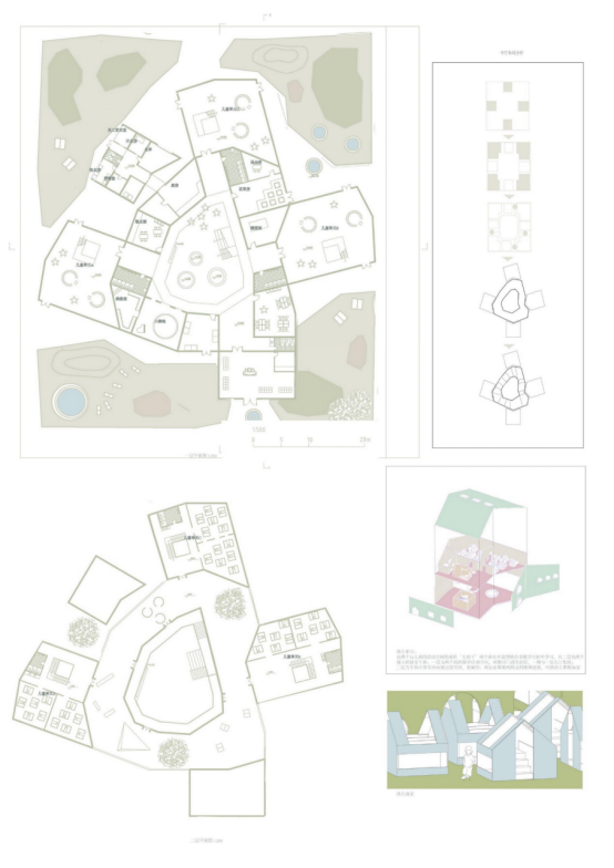 设计说明:本次方案在回应了多个物理因素和社会因素。社会因素重点回答增加幼儿集体与个人的矛盾问题。设计概念首先外围由三个幼儿居住单元围合,內围为多个目的性小场所的次级围合。具体造型分为三个层级,有多层级的活动空间的big house、个人独处的小空间small house、小型聚集的秘密基地和特殊教室middle house。各种小房子有不同事件可能性,空间上并列、嵌套、围合。本设计是一个内向型的建筑,在中心大厅big house完成丰富的功能使用。