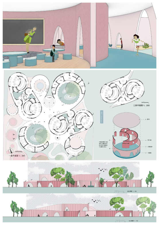 设计说明:以创造孩子们专属的有趣的小空间为目的,选取圆筒的元素,通过对人的行为分析,生成各个使用空间的雏形,再通过对场地周边环境的分析,对各功能空间进行布置。结合造型,考虑结构,最后不断调整中生成最终的方案。