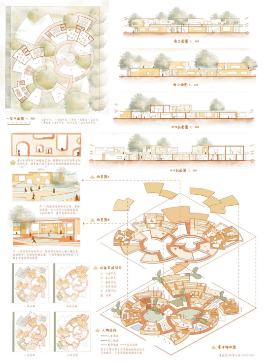 设计说明: 童年往往是人生中最值得回忆的岁月,孩子们天真善良,对世间万物充满好奇,对世间美好敢于追求,他们活泼好动,敢于冒险和挑战。对孩子们的充分尊重便是设计的核心。在综合考量(功能,心理,身体行为,场地需求)后,我提取了奶酪蛋糕的元素,场地群体空间布局为两个被切开的圆形奶酪,向心集中,短暂远离了世俗的喧嚣,享受专属于孩子们的童趣世界。儿童单元即为切开的扇形蛋糕,配合中心的梧桐树向外交错摆盘,提升空间丰富程度。最后单元的开窗参考了奶酪特有的空洞,配合孩子们的身体尺度。激发他们在儿童之家里面探索冒险的欲望,这时你有没有联想到可爱的JERRY呢?