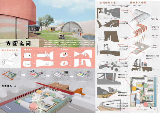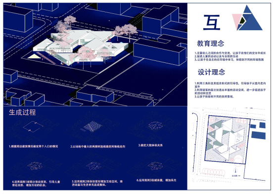 设计感想:在以往的设计任务中,我对形式操作并不敏锐。在此次设计一开始时也是像往常一样摸不着头脑,尝试了很多种设计思路。但是通过研究儿童行为特点我编写出了比较有意思的剧本并进行图解转化、提取抽象概念进而联系单元形式我找到了一种相对合理的组织方式。也吸取了之前提出的方案中做的比较好的地方,并用在这个方案设计中,反复修改从而完成了此次设计。也因此我知道了形式的操作并不是空穴来风或者简单的灵光乍现,好的方案是思考不断累积的结果。