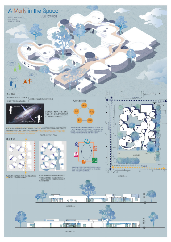 设计感想:这是一个充满童趣的设计,我们站在儿童的思维去思考他们喜欢什么,需要什么,也是一个回忆自己儿童时期的过程,把自己对孩童生活的期待融入到这个设计中。除此之外这个设计也是对二年级所学知识的一个总结,从事件行为空间的转化,到场地设计,再到结构的思考,以及造型与功能的相互适应,都需要在这个设计中得到体现,在付出了很多努力的同时也收获到了很多。