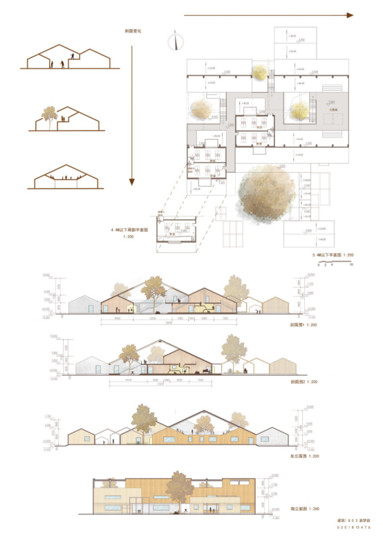 设计概念:本次我的儿童之家设计的主题是“互”,意图创造出一个既有独立活动场地,也能有利于儿童与儿童、自然之间互动的小世界。我根据理想家宅的设计方法,描绘了一个儿童的成长剧本并进行了图解转化,也由此提取出一种的空间关系——视线上联系但可达性在两个维度上并不对等的空间关系,由此我联系到二极管的物理符号,从中提取出三角形的符号,并对其进行同向和异向的不同程度的组合,从而形成三种空间单元。空间单元连接同样是进行同向和异向的组合,通过平面设计将小庭院、中心庭院、场地树木连接起来,达到促进儿童与场地自然环境的互动;通过剖面设计使儿童活动空间在横向和纵向都连结为一个整体,从而达到促进儿童之间互动的目的。