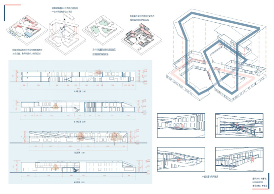 设计感受:本次设计过程中,遇到的困难基本集中在群体空间的转化部分。斜线要素如何跟场地有一个较好的融合是本次设计的难点,过程中做了近十种可能的形态尝试,在周老师的指导下从中选出最好的一种进行深化发展,一路走来,坎坷不断,但同时也得到了很多关于群体空间组织的经验教训,希望以后可以做的越来越好!