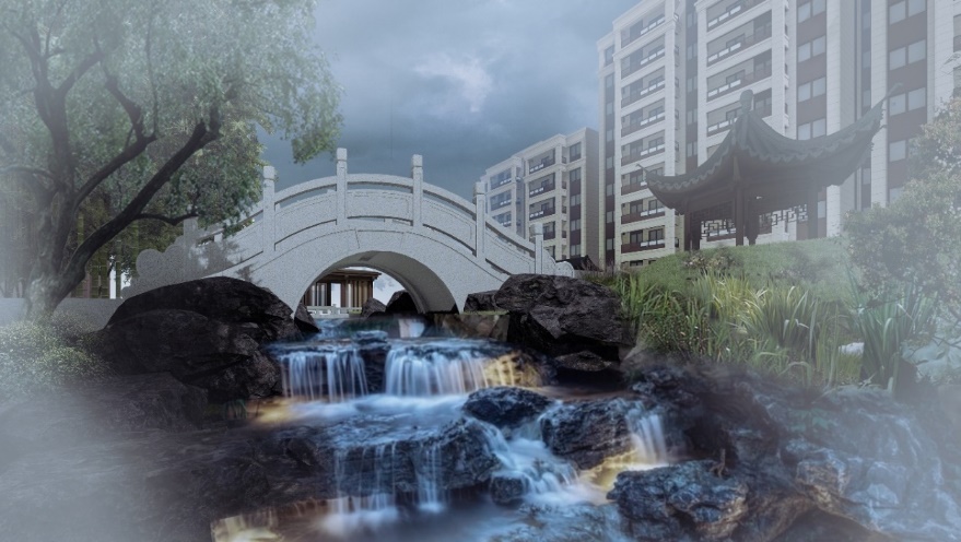 中心景区雅境·裁水涟漪有山石叠瀑,古水小桥、景墙廊亭。雅境亭子的位置借鉴了中国古典园林的虚实处理手法,同时也遵循高层住区的变化情况。在高层住区中亭子需要天空作为画布,在其上布置天际线。