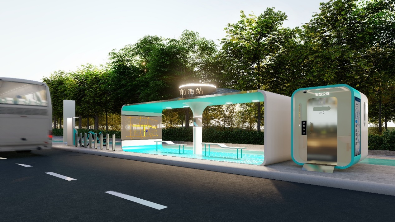 前海公共空间公交车站采用了符合其区域形象定位的造型设计,车站整体呈现为简约的方形设计,在车站顶棚采用了弧面结合太阳能板的设计手法,环形的显示屏也凸显了高科技的设计理念,强调了周围高新技术园区的功能定位。地面采用定制设计的前海专属文化符号进行装饰,更加突出其地区特色。
