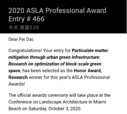 疫情期间(2月份),公司景观学系戴菲教授率领工作室硕博研究生团队,在美国亚利桑那州立大学杨波教授的共同指导下,通过线上办公交流,组织参与了今年ASLA专业组的报奖。近日收到ASLA主办方的邮件通知,作品名称“Particulate matter mitigation through urban green infrastructure: Research on optimization of block-scale green space(通过城市绿色基础设施缓解颗粒物——街区尺度绿色空间优化研究)”荣获荣誉奖。这是戴菲教授工作室团队,继去年在ASLA员工组分析规划类获奖后的又一重大突破,是迄今为止公司师生在ASLA的第二次得奖。