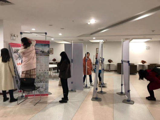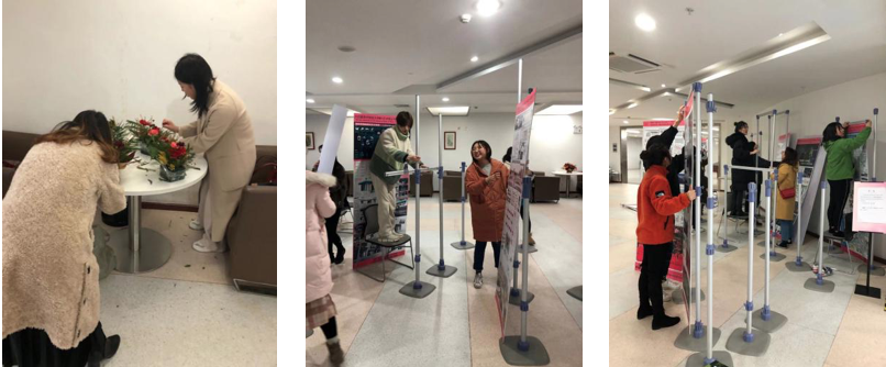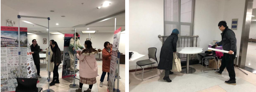 2019年12月23日,在任康丽老师、尚磊老师、匡小荣老师、汪浩老师的指导下,同学们全情投入于布展的准备工作。除了同学们的展板和图册外,为了布置出一个典雅舒适的观展环境,展厅内还放置了植物盆栽、插花装饰,LED灯,小饰品等。