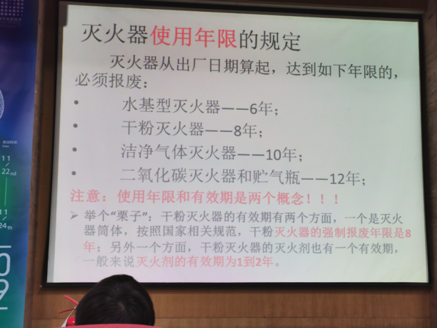 在使用灭火器时一定要冷静,确保灭火器是安全可用的。在使用灭火器前,要先进行三看。一看,看灭火器外观是否完整。看底部是否有锈蚀,软管是否有裂痕;二看,看压力。表盘上黄色表示过充,绿色表示正常,红色表示压力不足,指针在黄色和绿色处表示灭火器可用;三看,看铭牌,看灭火器是否在使用年限内,灭火剂是否在有效期内。对于灭火器的使用,老师全面的讲解了相关事宜,有效地提升了同学们对消防安全技能的掌握。