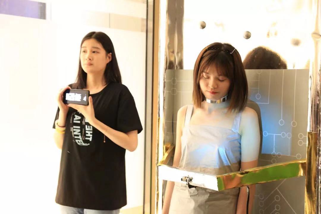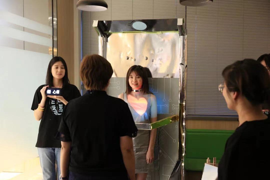 《心动机器姬》从数字媒体艺术,通信工程,电子信息工程,视觉传达,工业设计等多学科的跨领域交叉学科角度进行设计,打造一个会对人类产生心跳反应的机器“人”的发布会现场。