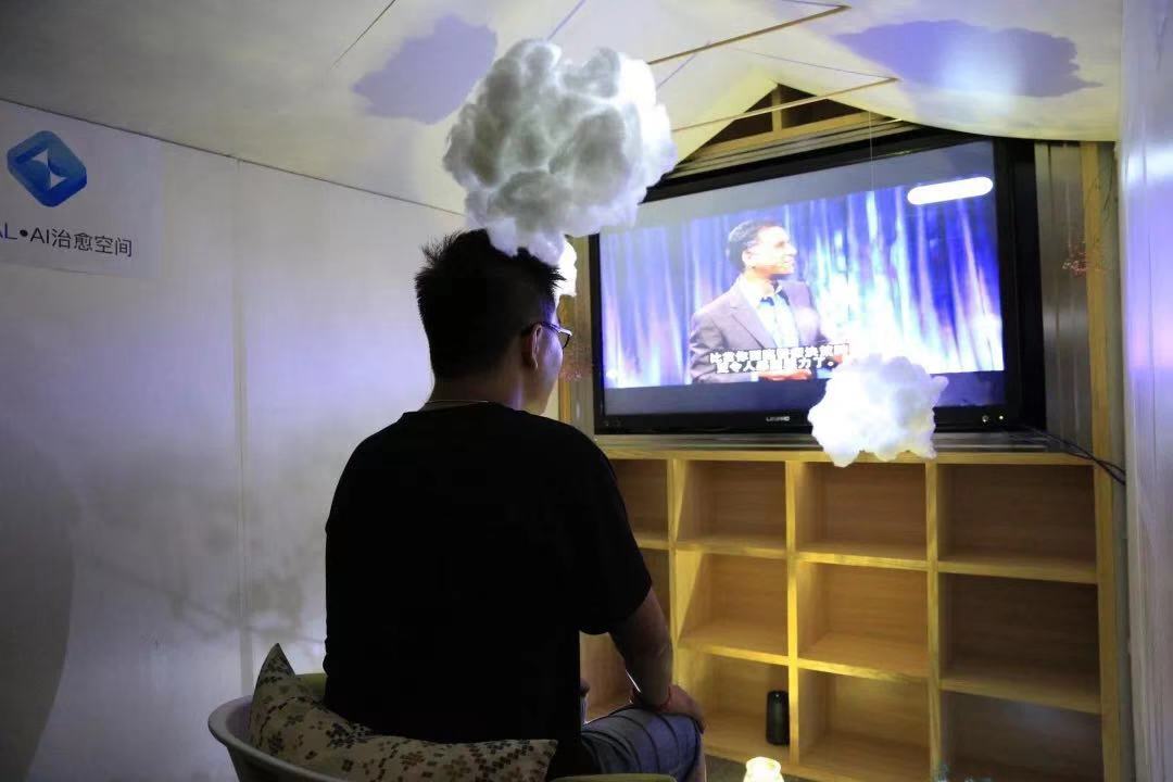 首先,提供一个能保护用户隐私的私密空间,空间内配备灯光、音乐等元素;其次,结合人工智能技术,空间内部有一块显示屏,屏幕上具有虚拟机器人,能实现人机对话,同时记录用户的一系列行为信息,并适时做出反馈,反馈包括机器人提供解压建议,声光场景变化等。