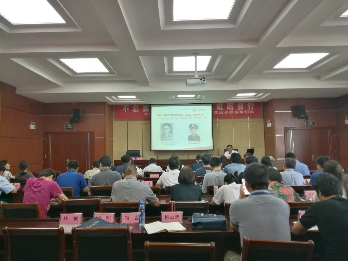 课堂教学期间,赵丕副董事长为大家做了《两膺上将洪学智留给我们的精神财富》的专题报告。洪学智是人民解放军历史上唯一两次授予上将军衔的高级将领,被称为“六星上将”、“两膺上将”。“出生于双河农家,从戎于商南起义,显赫于南征北战,扬威于抗美援朝,彪炳于现代后勤奠基,辉煌于改革开放创新。”这是洪学智将军墓碑文的一部分,洪学智将军一生“人到哪里,军功建到哪里”。新中国成立后,洪学智以“参加革命不是为当官,有利于革命的事我就干”的博大胸怀,对党忠诚、矢志不渝,无怨无悔、努力工作,为国家建设贡献自己毕生力量。赵丕董事长的讲解饱含深情,极富感染力,深入挖掘金寨精神和大别山精神的红色底蕴,大力宣扬共产党员应有的本色,教育引导大家不忘初心、牢记使命,砥砺前行。