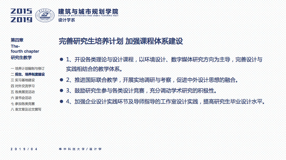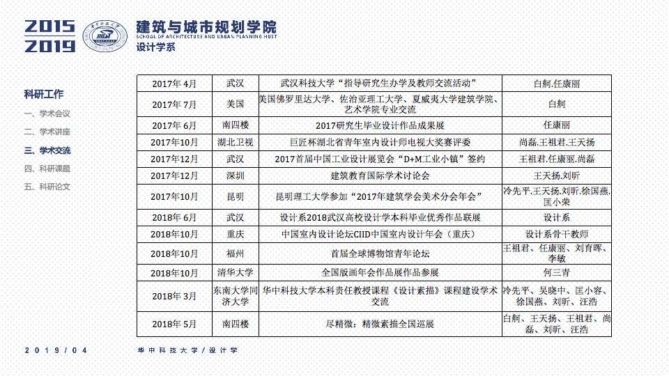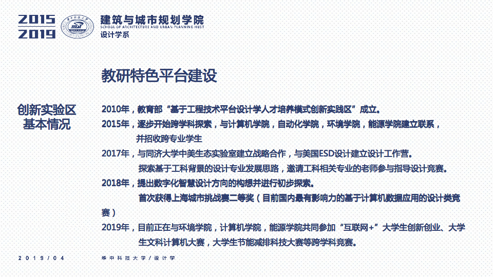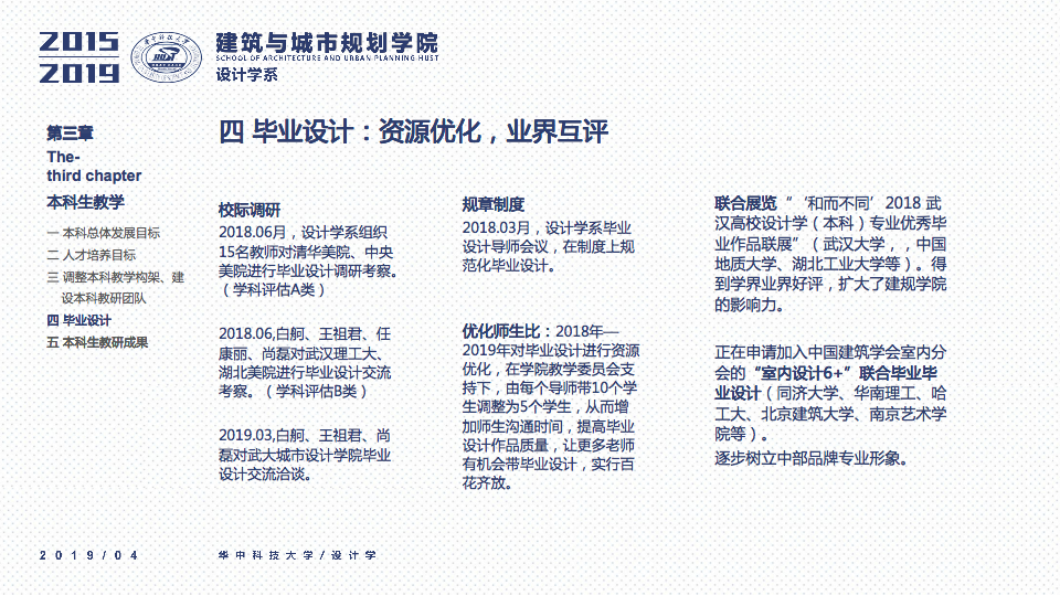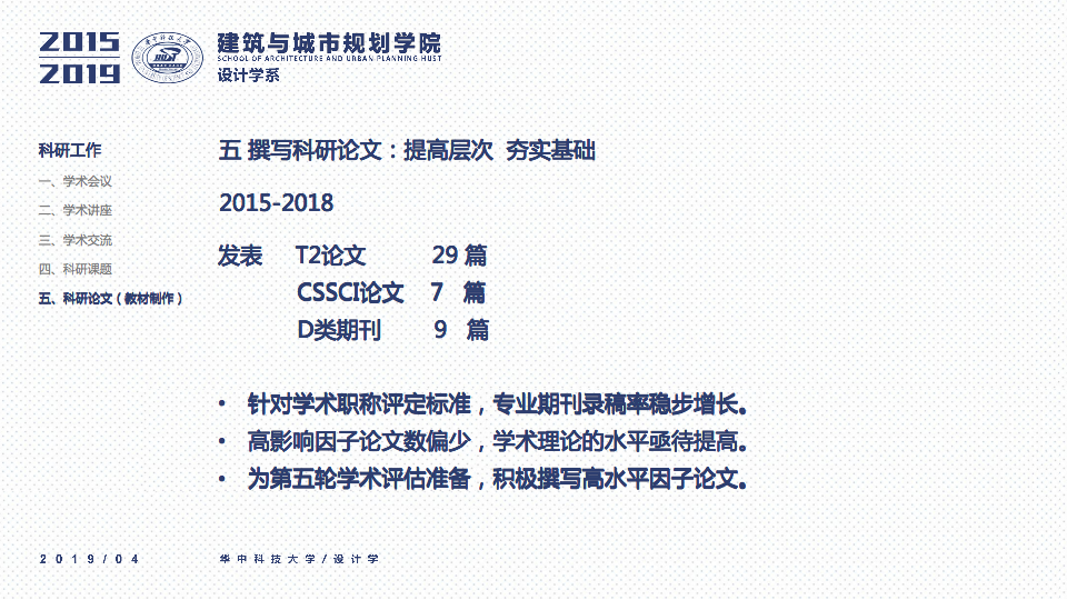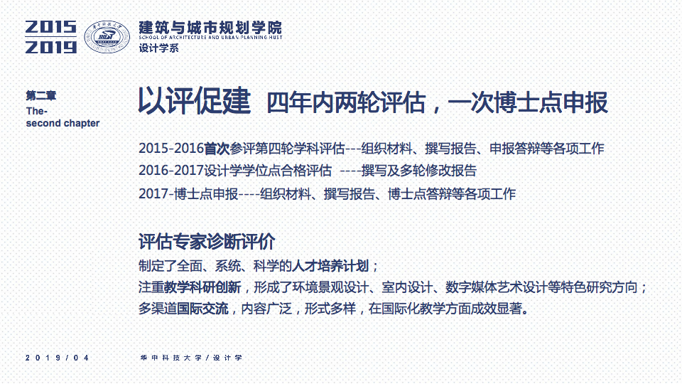 秉承设计学系“学科交叉、突出特色、创新为本”的办学要求,立足于“湖北省品牌学科”、“湖北省重点学科”的基础之上,一直坚持“打造特色优势学科方向及团队”作为团队建设与科研工作的立身之本。四年以来,重点围绕以评促建、本科教学、研究生教学、科研工作、团队梯队与平台建设、成果总结、社会服务等七个方面来开展工作,在以评促建的工作体制下,举全系之力,参与全国高校设计学专业公司等级的排名评估,首次参加第四轮学科评估即获得“B-”等级(并列全国28位),同时通过了设计学学位点合格评估,并组织开展了博士点申报等各项工作。为下一轮评估与申报打下了坚实的基础并取得了宝贵的经验。